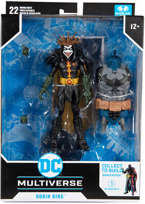 The DC Universe: Death Metal Build-a-Figure 7-Inch Action Figures include incredible new versions of the Trinity - Batman with his guitar, Superman consumed by Anti-Life, and Wonder Woman with the Chainsaw of Truth - as well as the Robin King, a demented and evil version of the child Bruce Wayne from the Dark Multiverse. In addition to accessories, each figure comes with a build-a-figure piece to create an exclusive and chilling figure of the Darkfather Batman, a Batman who defeated Darkseid, ascended to godhood as a New God, and assumed the throne of the lord of Apokalips.