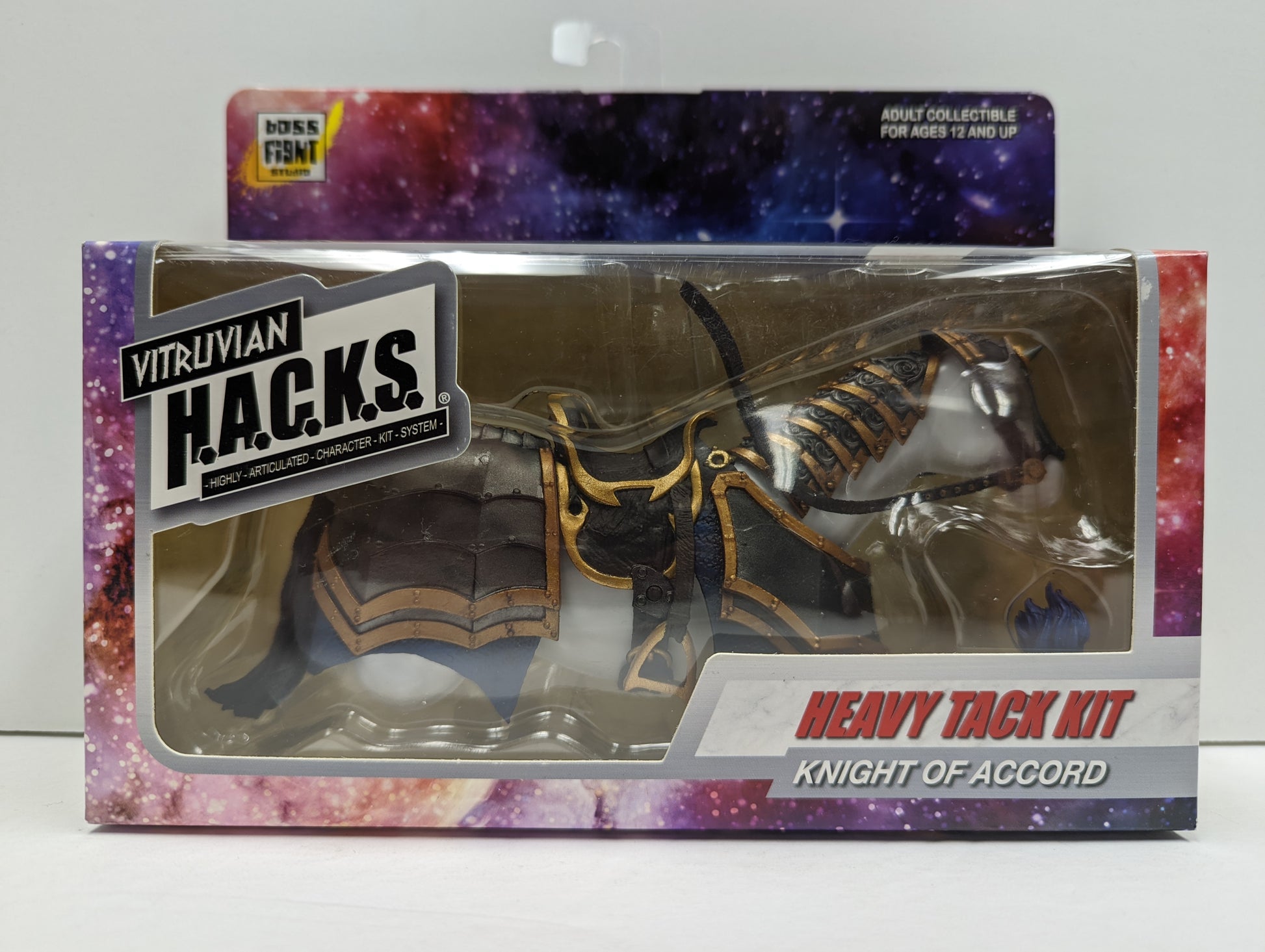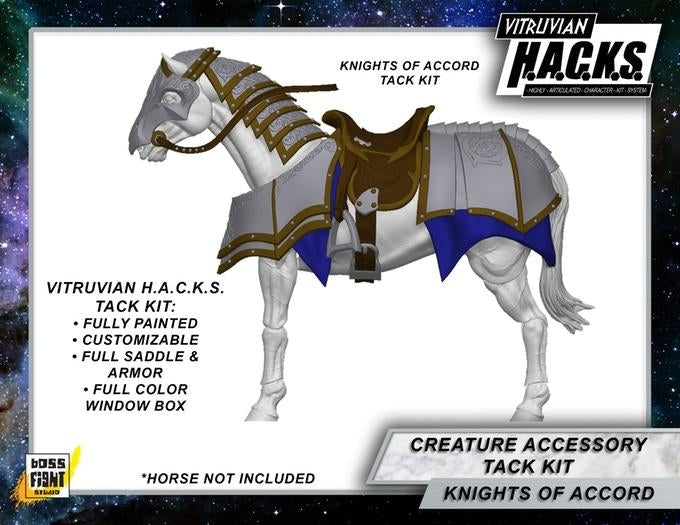 The Knights of Accord need an armored steed to ride into battle upon. Painted in silvers and gold to match the Knights of Accord, you can protect your horse from the Orc Army with the Knight of Accord Tack Kit! Includes: Full-color box, Saddle, body armor, neck armor, helmet, harness, reins, and stirrups